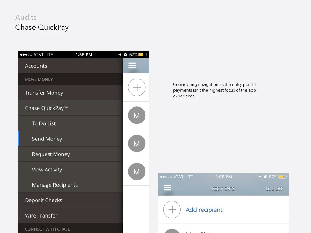 Chase QuickPay, a feature for peer to peer payments and transfers within Chase's mobile app, was interesting for thinking about navigation entry points.