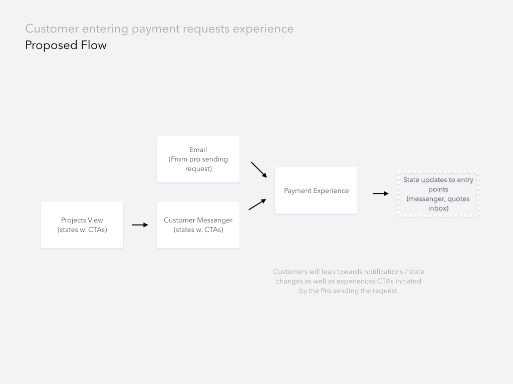 Before I had joined, the team had spent a few months on research via market assessments and interviews of customers and professionals to understand payment methods and tracking/invoicing as well as any issues or concerns in payment experiences in the project initiation to completion phases. This research specifically focused on customers and pros in single, non-recurring, payment categories on our platform, such as tv mounting, massage therapy, and portrait photography.