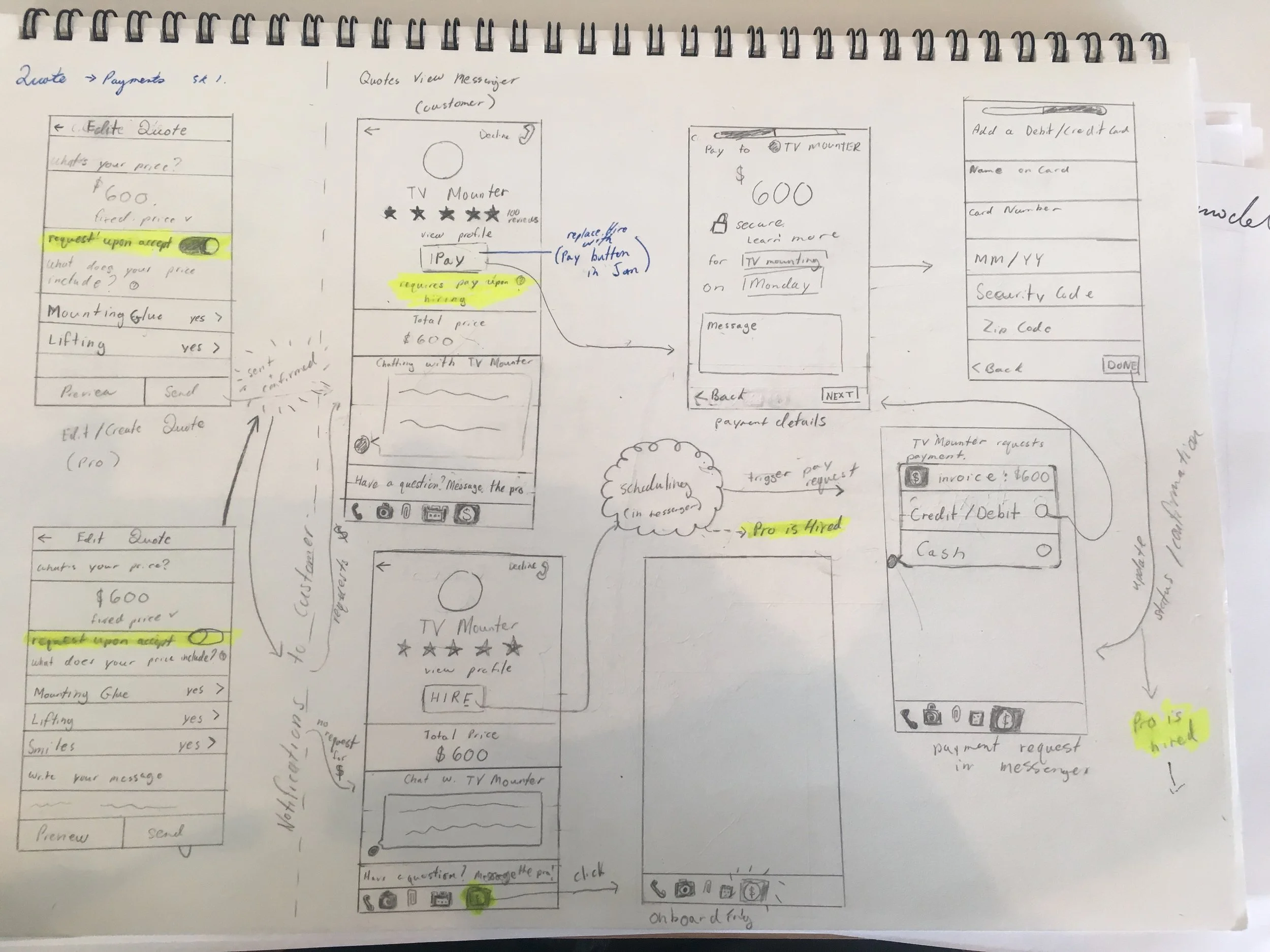 In journey mapping, I saw avenues and opportunities where payments could be timely, as well as lead to paths of “marking professionals as hired” for project completion and a Thumbtack guarantee of protection.